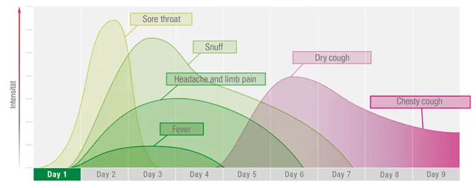 Apart from symptoms such as a runny nose and sore throat, and sometimes elevated temperature or fever, the symptoms of the common cold also include those annoying headaches, sore muscles and general aches and pains. One just feels battered. As the saying goes regarding the duration of a cold: "It's three days coming, three days staying and three days leaving". Right! Colds bother us for just about one week - and in most cases it is gone after that.